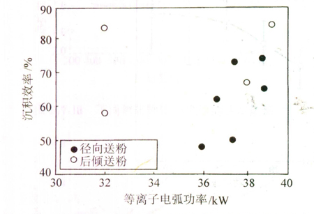 圖1 氧化鋯涂層沉積效率隨等離子電弧功率的變化