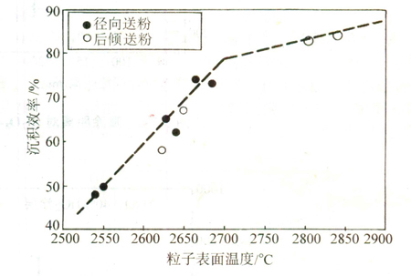 圖3 氧化鋯涂層沉積效率隨粒子表面溫度的變化