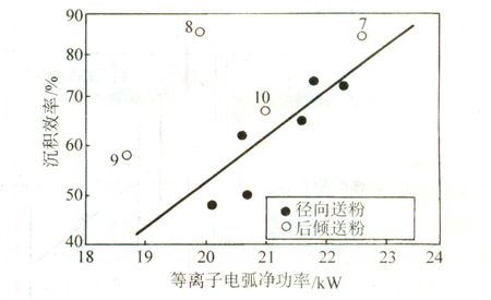 圖2 氧化鋯涂層沉積效率隨等離子電弧凈功率的變化