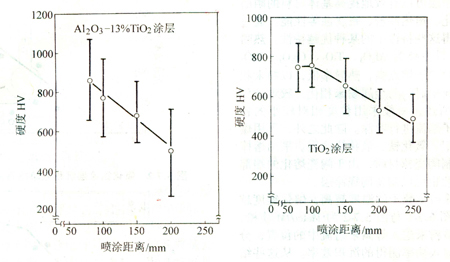 圖6 噴涂距離對(duì)Al2O3-13%TiO2涂層顯微硬度的影響