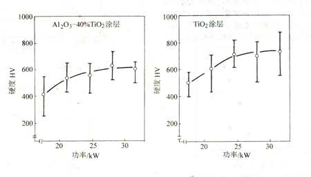圖7 等離子功率對(duì)Al2O3-40%TiO2與TiO2涂層顯微硬度的影響