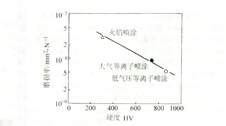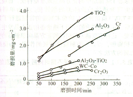 陶瓷熱噴涂層的溫度擴(kuò)散系數(shù)隨材料種類而異,并受到噴涂條件的影響。圖10為幾種典型氧化物陶瓷涂層的溫度擴(kuò)散系數(shù)。研究結(jié)果認(rèn)為這種溫度擴(kuò)散系數(shù)的大小對(duì)涂層的耐磨損性能具有影響,與圖11所示的磨損試驗(yàn)結(jié)果比較,兩者之間具有一定的相關(guān)性,即溫度擴(kuò)散越高,磨損速度越小,耐磨損性越好。當(dāng)然如上所示,涂層的硬度也對(duì)耐磨損性能有影響。