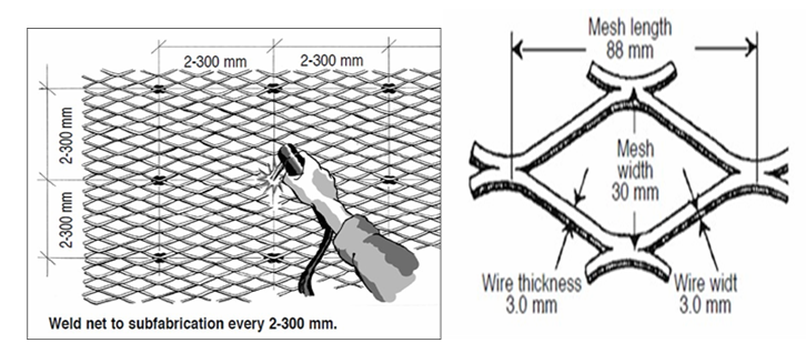 *焊接時(shí)先將圓鋼切割成合適的長(zhǎng)度,其中圓鋼間距為200mm,焊縫間的距離為200mm,放置位置須符合形狀要求;認(rèn)真仔細(xì)地放置網(wǎng),并將網(wǎng)焊到棒上,龜甲網(wǎng)上焊縫之間的距離也為200mm。