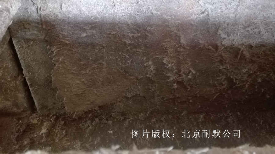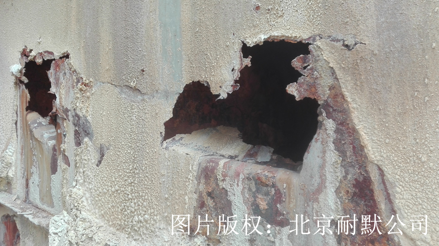 圖(3)原有內(nèi)襯防腐層已經(jīng)面目全非,據(jù)車間人員說(shuō)每次開機(jī)當(dāng)日部分防腐層會(huì)脫落,北京耐默公司技術(shù)工程師馬遙認(rèn)為此問(wèn)題是因?yàn)楦邷厥?/u>